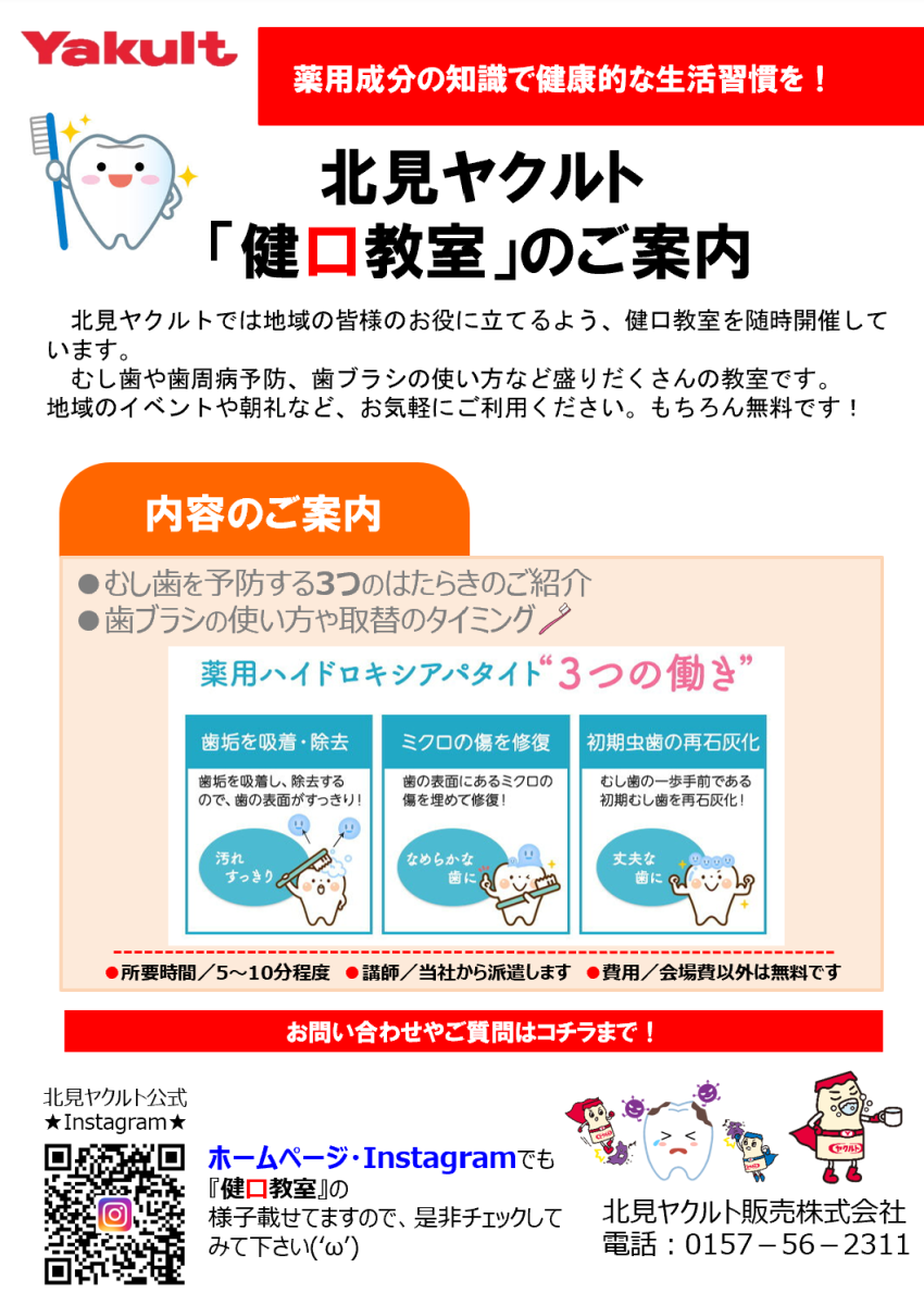 新着情報NewsHome新着情報歯の「健口教室」のご案内について歯の「健口教室」のご案内について2025.09.09新着情報 北見ヤクルトでは地域の団体様、企業様向けに無料で歯の健口教室を開催しています。お電話にてお問合せ、ご依頼お待ちしております。また、おなか健康教室のご依頼も併せてお待ちしております。 BACK 社員募集ヤクルトスタッフ募集
